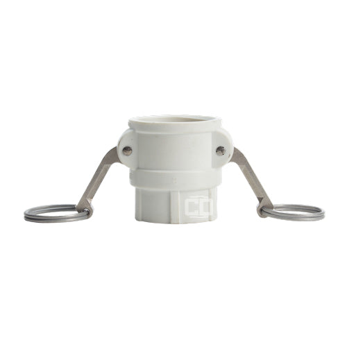 Type "D" polypropylene 1 1/2 inch female camlock (Cam & Groove) coupler to 1 1/2 inch female NPT threads.