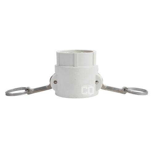 Type "D" polypropylene 2 inch female camlock (Cam & Groove) coupler to 2 inch female NPT threads.