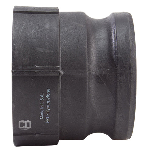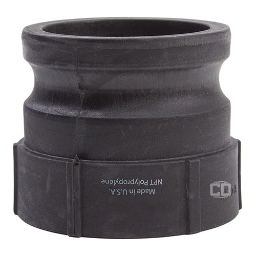 Type "A" polypropylene 3 inch male camlock (Cam & Groove) coupler to 3 inch female NPT threads.